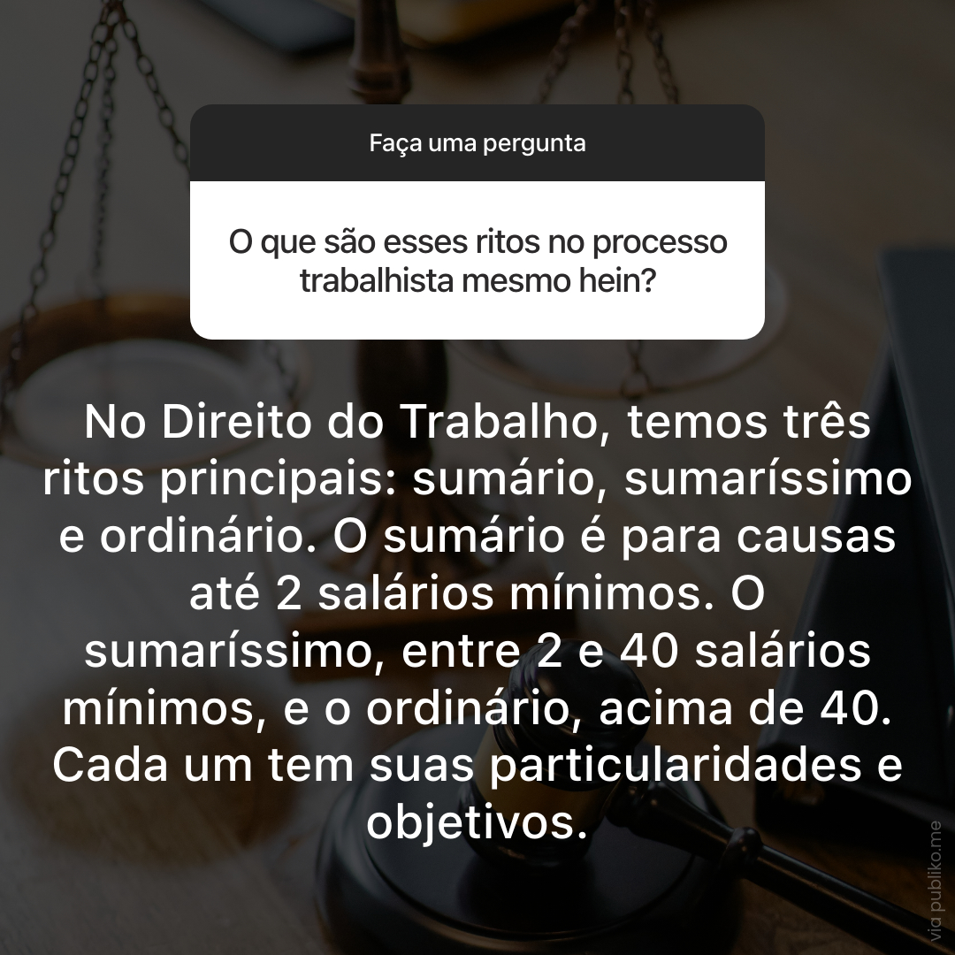 No Direito do Trabalho, temos três ritos principais: sumário, sumaríssimo e ordinário. O sumário é para causas até 2 salários mínimos. O sumaríssimo, entre 2 e 40 salários mínimos, e o ordinário, acima de 40. Cada um tem suas particularidades e objetivos.